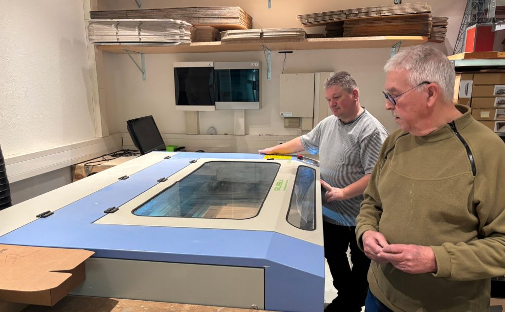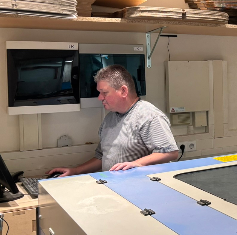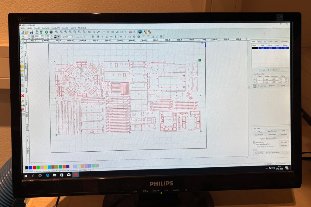 Op de computer wordt eerst het snij- of graveerbestand zorgvuldig voorbereid. Pas wanneer we tevreden zijn over de testresultaten, starten we met het daadwerkelijke werkstuk. Dit voorkomt verspilling van materiaal en zorgt voor een strak, consistent eindresultaat.